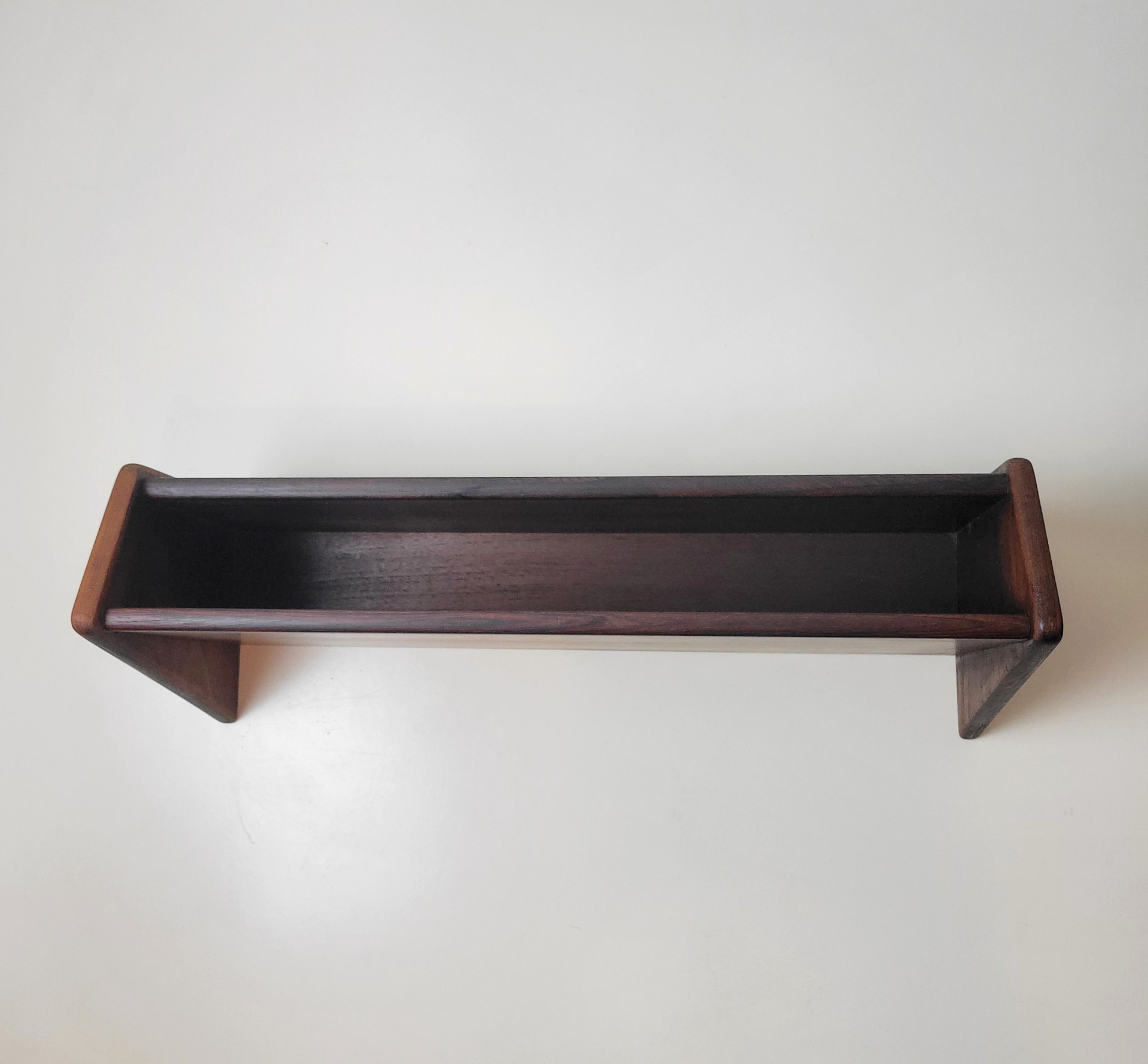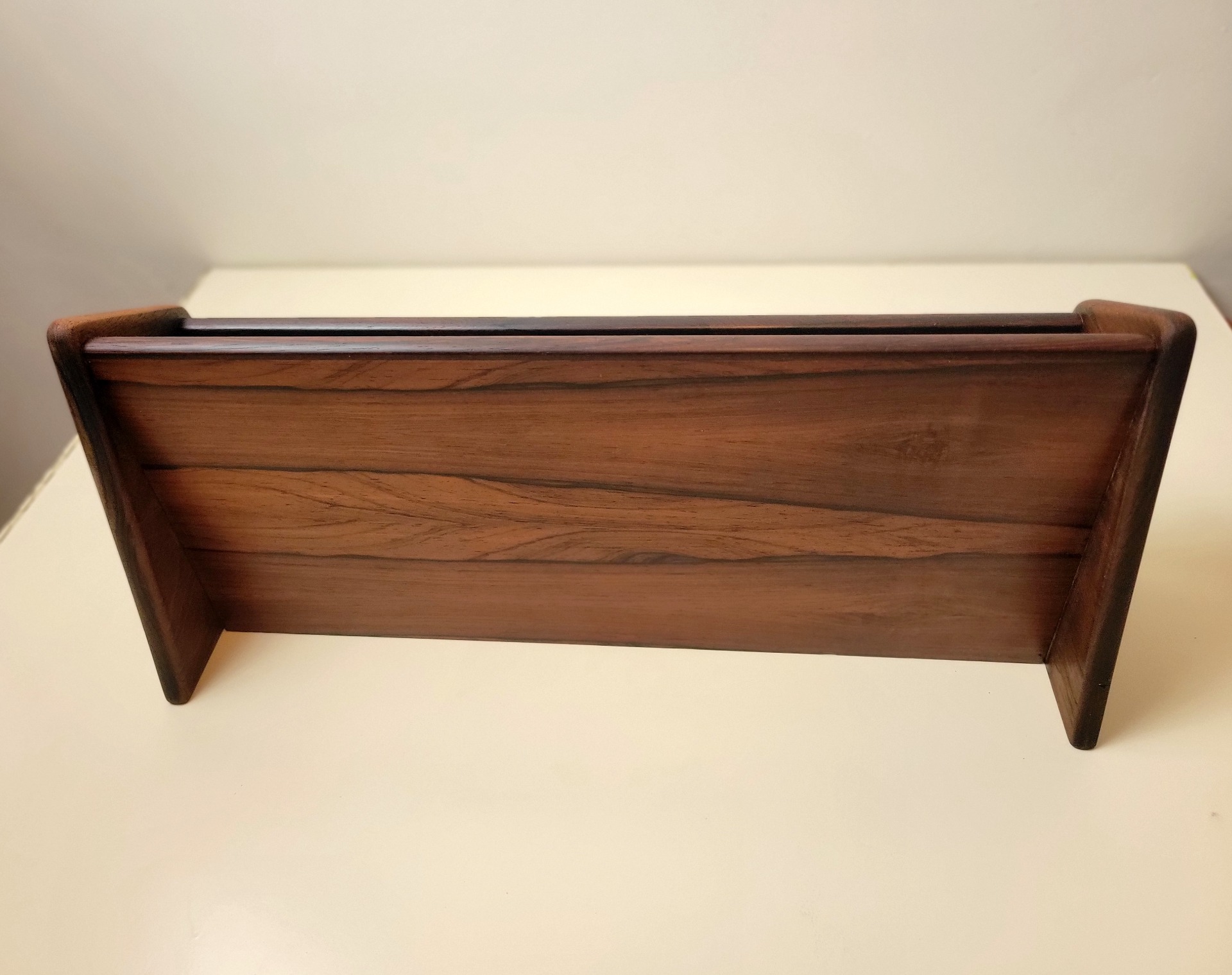 Bijzonder fraaie wandplank, model 24, van palissanderhout, ontworpen door Kai Kristiansen en geproduceerd door Aksel Kjersgaard, Denemarken, circa 1960. Een wandplank die ook als nachtkastje gebruikt kan worden, met als voordeel dat ze precies op de gewenste hoogte naast het bed geplaatst kan worden, terwijl de vloer vrij blijft. De wandplank kan ook mooi staan in combinatie met een spiegel in een hal. De wandplank verkeert in hele nette vintage staat.