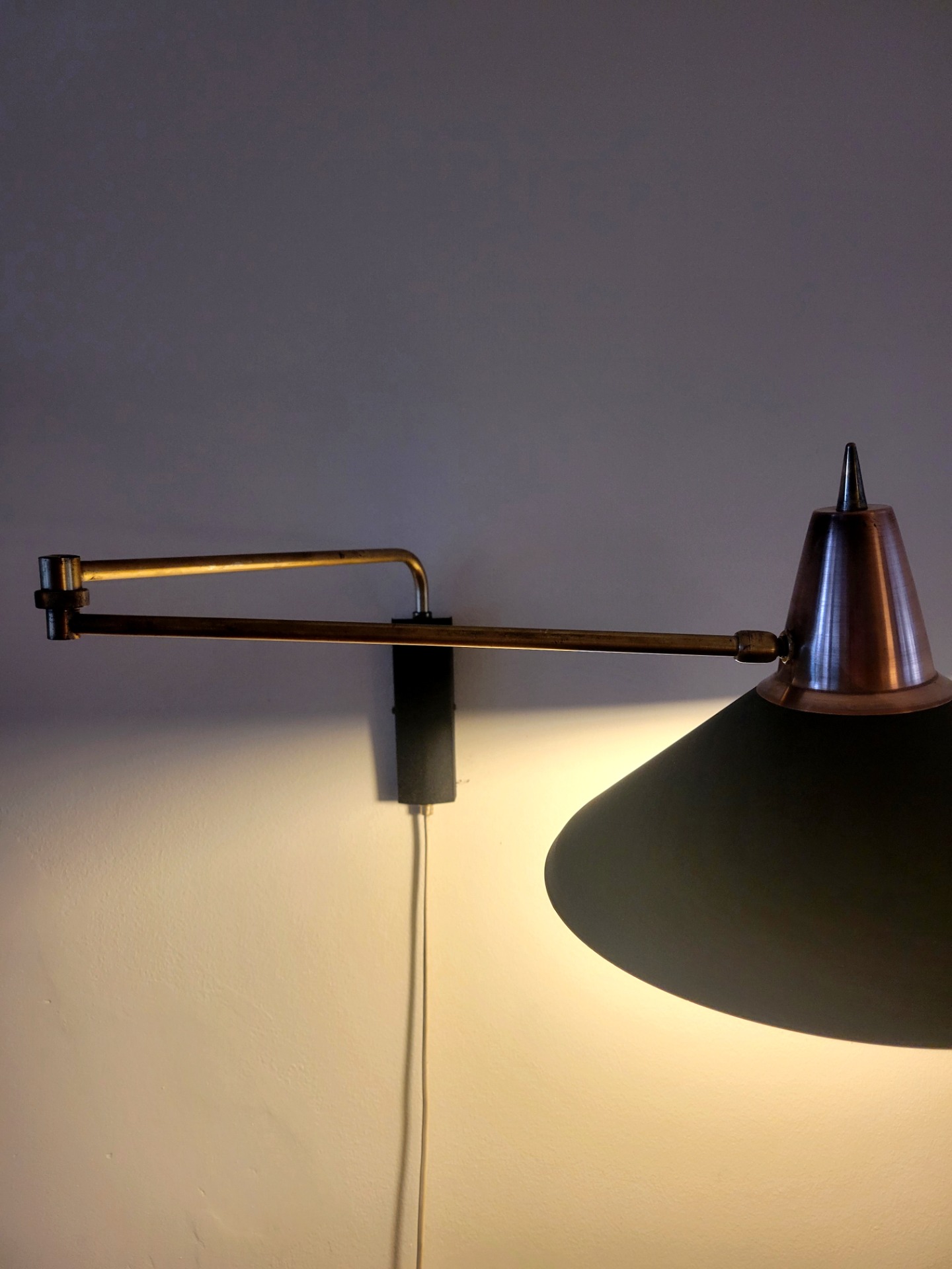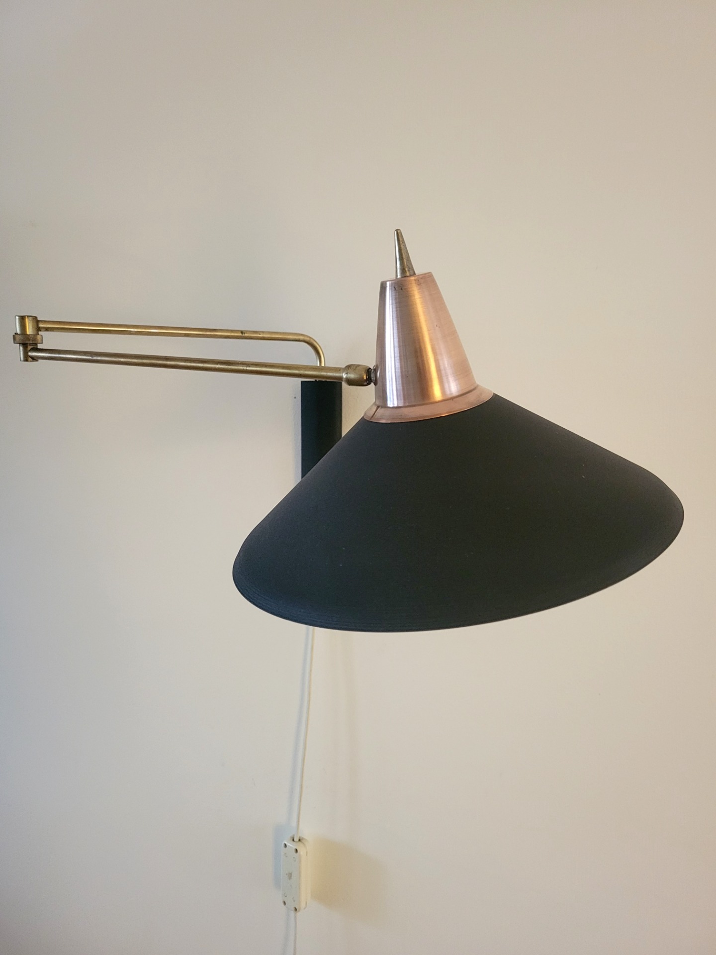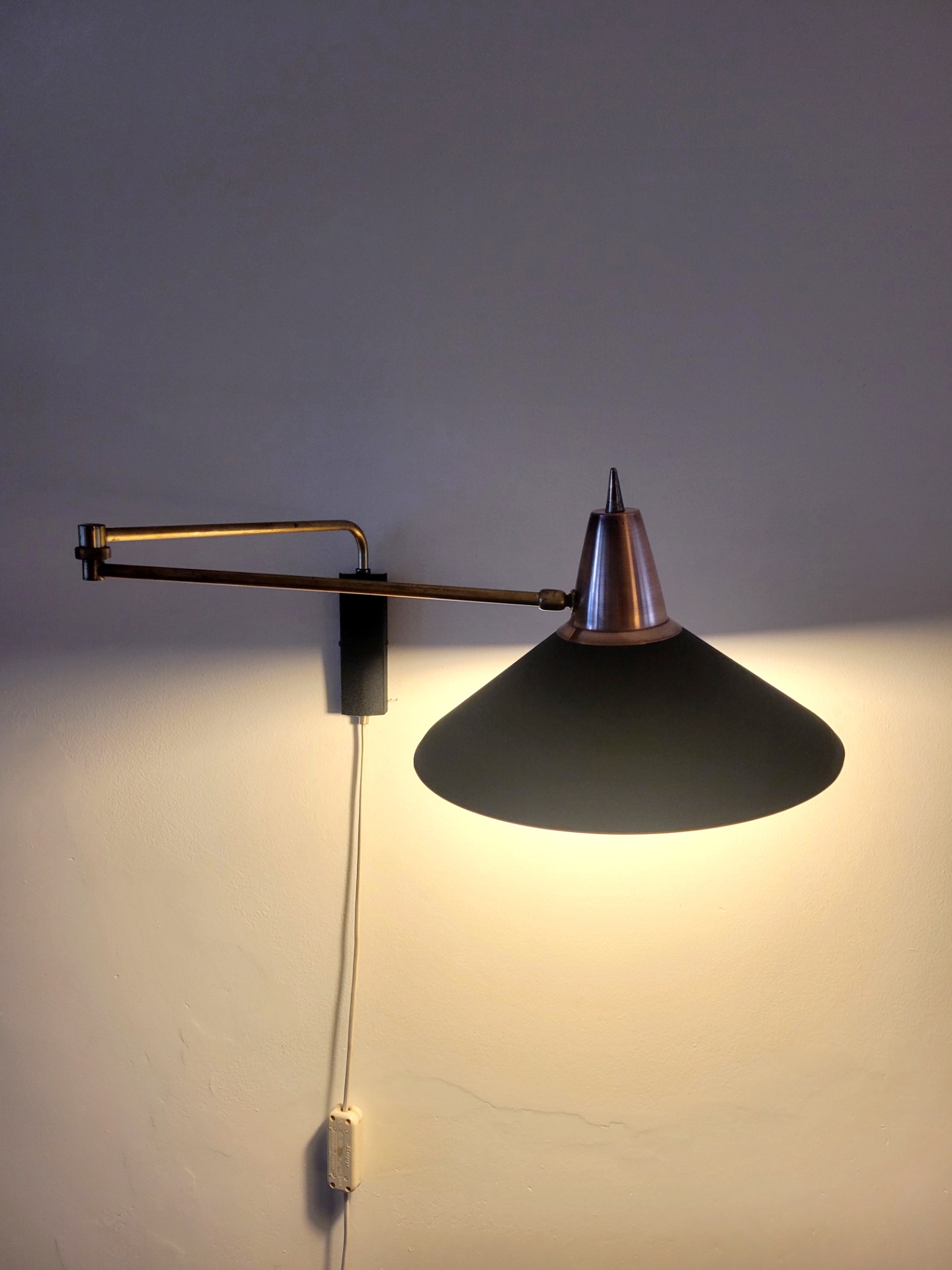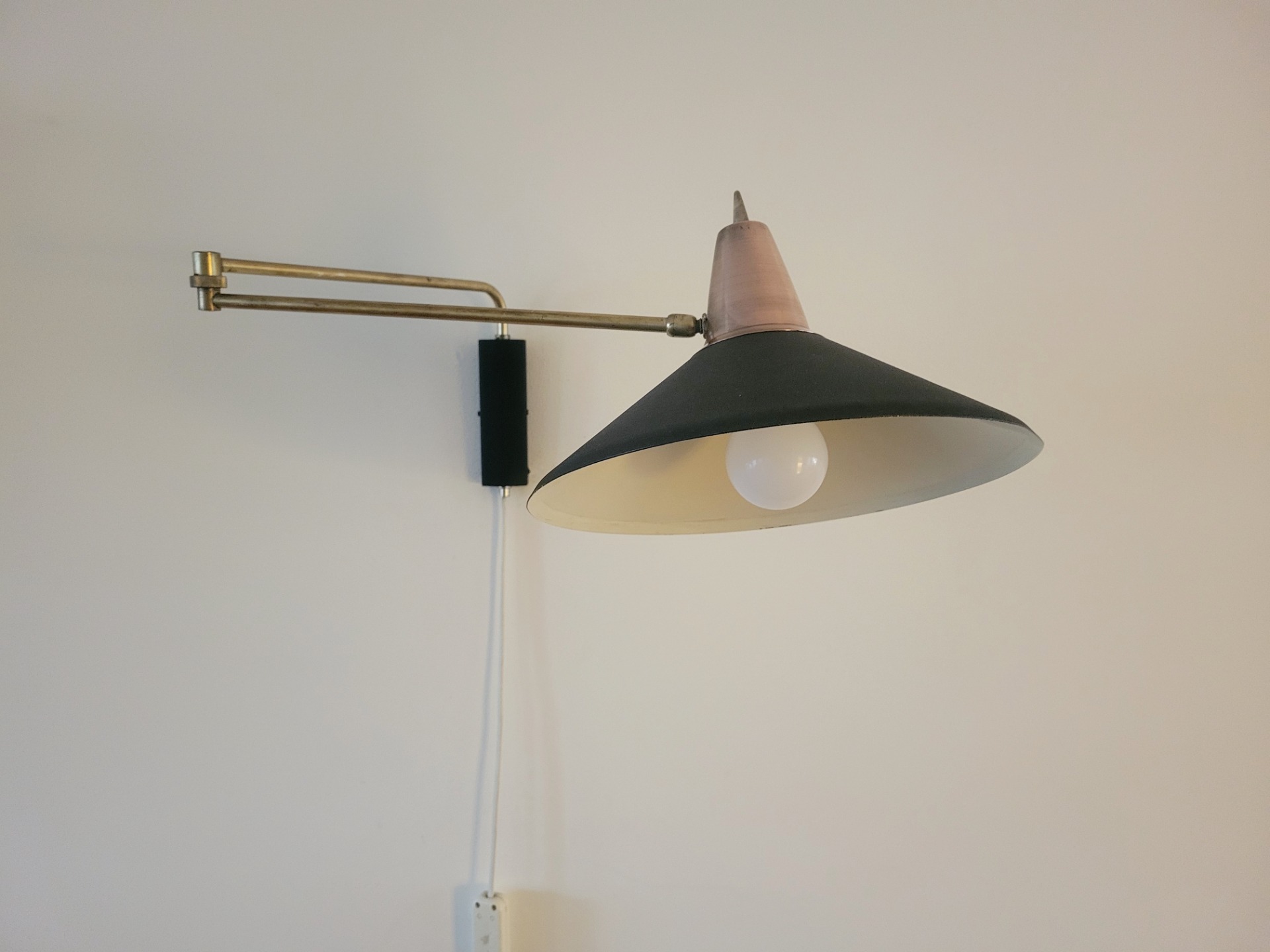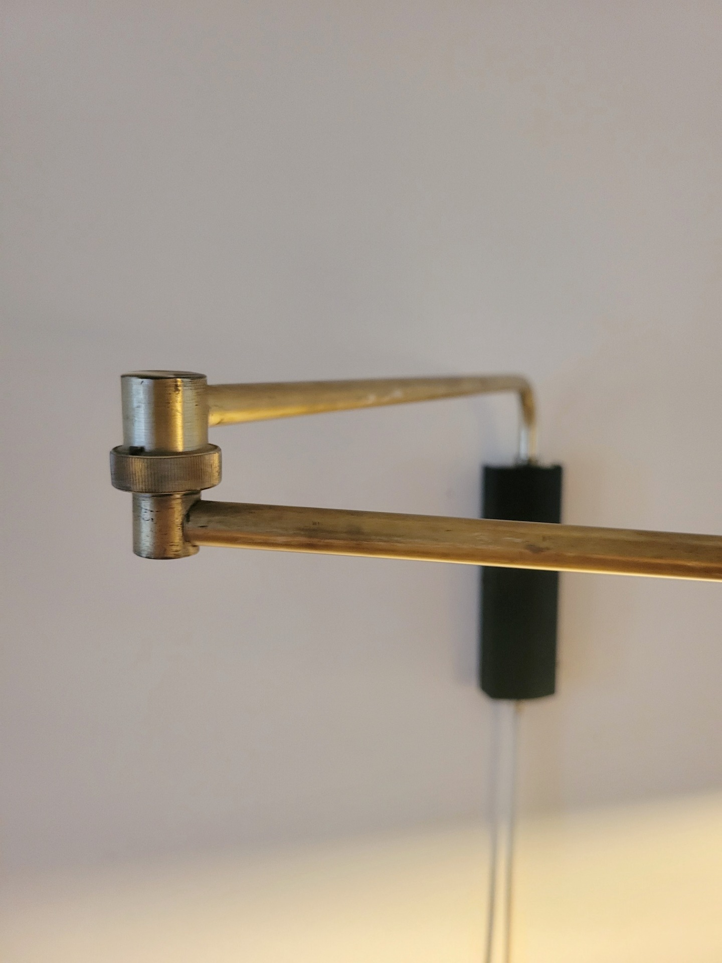 Mooie wandlamp van van Doorn Culemborg uit de jaren '50. De lamp heeft een messing kleurige zwenkarm die zowel naar rechts als links bewogen kan worden. De kap is door het scharnier in verschillende standen te plaatsen. De lamp is in nette vintage staat met lichte sporen van gebruik conform leeftijd.