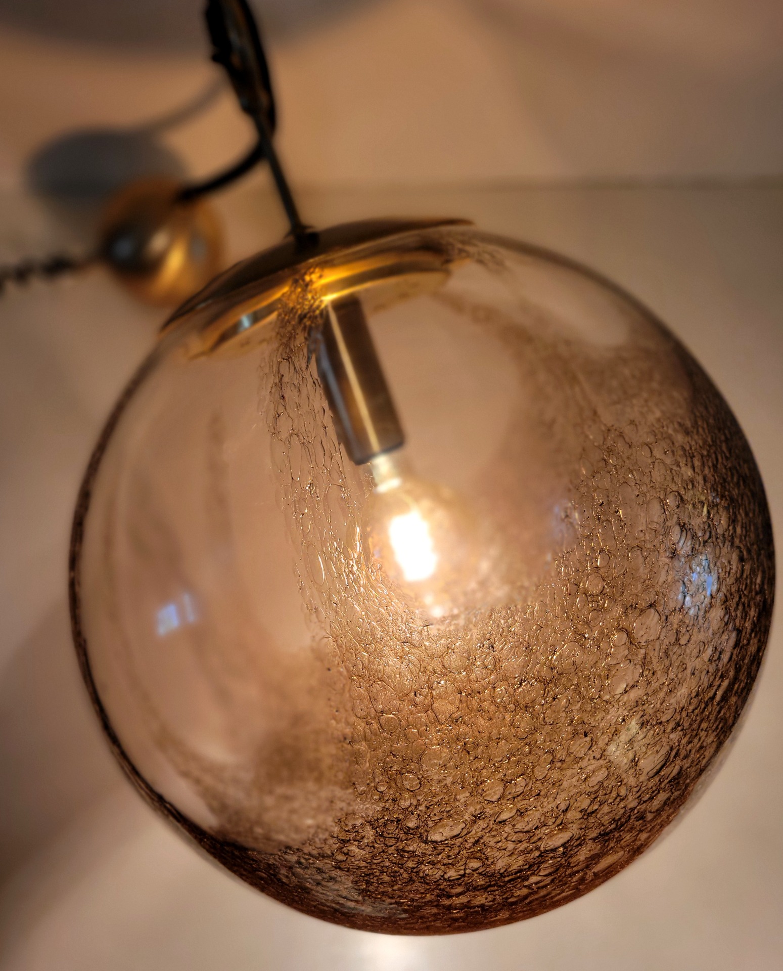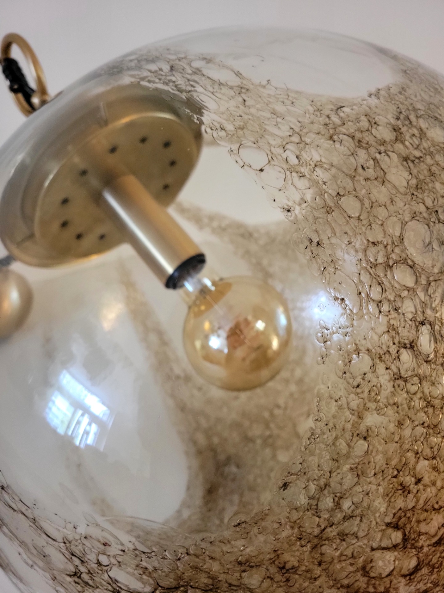 Zeer bijzondere hanglamp van La Murrina, Italië 1970. De grote mond geblazen Murano glazen bol is voorzien van een messing kap. Het bovendeel van de globe is van helder transparant glas. Vanaf het midden tot de onderzijde heeft het glas fijn gevormde bruine luchtbellen, die als de lamp brand, een fraai lichtspel geeft. De lamp is voorzien van de originele messing plafondkap en trekpendel, waardoor de lamp in hoogte te verstellen is. De lamp verkeert in hele goede staat en heeft op een plek een lichte kras op het glas die op het oog niet zichtbaar is omdat deze zich aan de bovenzijde van de bol bevind.